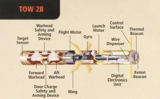 В 1992 году на вооружение в США поступила ПТУР BGM-71F (TOW-2B), созданная на базе BGM-71E. Новая ракета могла поражать цель сверху — в наиболее уязвимой её части. ПТУР BGM-71F оснащена новой модифицированной боевой частью с двойным зарядом направленного взрыва, ориентированным под углом 90° к продольной оси ракеты, и двухрежимным дистанционным взрывателем, включающим в себя лазерный высотомер и датчик магнитных аномалий. Подрыв боевой части происходит при пролёте ракеты над целью, которая поражается сверху танталовым ударным ядром. Подрыв боеголовок диаметром 149 мм происходит одновременно, действие одной направлено вниз, а другой — с небольшим сдвигом назад для обеспечения большей вероятности поражения цели. Материал для формирования ударного ядра выбран с целью создать максимальный зажигательный эффект после пробития верхней брони танка.