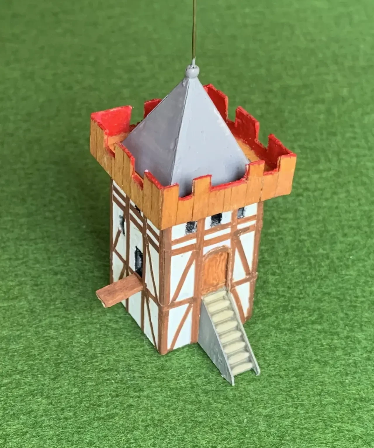 Донжон: картон, полоски раскрашенной бумаги, деревянные рейки шириной 2 мм, лестница из гофрированного полистирола