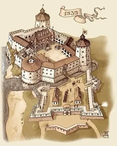 Замок XVI в. Башни и стены замков утолщаются. В них теперь располагаются казематы с орудиями. На смену передовым укреплениям в виде стен и башен приходят бастионы