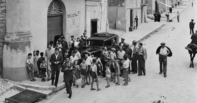 На фото слева: визит Муссолини на Сицилию. На фото справа: типичный городок Сицилии