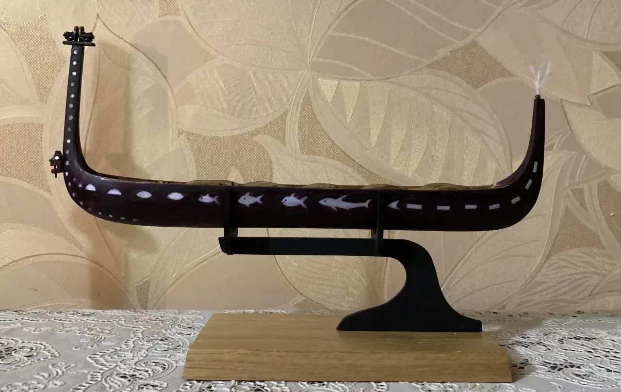 Но вот прошло 60 лет, и я наконец-то смог осуществить мечту своего детства, то есть сделать модель пироги охотников за головами с Соломоновых островов. А началось всё с того, что в Интернете я обнаружил сайт моделиста с Гавайских островов Френсиса Пиммеля. Занимается он тем, что мастерит модели различных полинезийских судов, которых, как оказалось, на Тихом океане превеликое множество: на каждом архипелаге свой тип пироги и свои украшения. И как среди его моделей нашлась и пирога с Соломоновых островов, причем с корпусом, инкрустированным кусочками перламутра от раковин. Решил повторить ее, заказал перламутр с острова Бали, поскольку модель для самого себя должна иметь «аромат далеких островов».