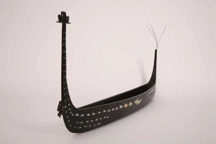 Носовое украшение представляет собой сросшихся спинами «мужиков» в желтых шапочках задумчиво подпирающих руками свои крокодилообразные физиономии