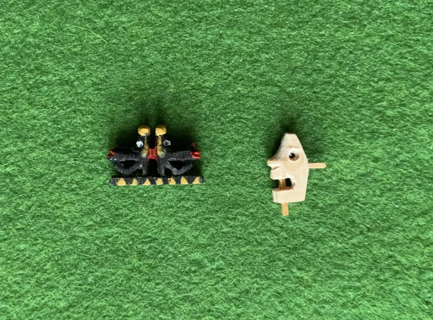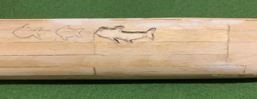 На эту самую пирогу нужно целых десять совершенно одинаковых весел, причем желательно, чтобы их украшали хоть какие-то резные узоры… Сделать точно такие же весла достаточно сложно. Но я в данном случае использовал планки от старого китайского веера. Снял с него ткань, после чего обрезал пластинки по размеру, вложил между ними черную копировальную бумагу и склеил клеем ПВА. Теперь сквозных прорезей на веслах не было, а были очень даже практичные заготовки, которые осталось только лишь обточить требуемой формы и чтобы рукоятки у них были круглыми.