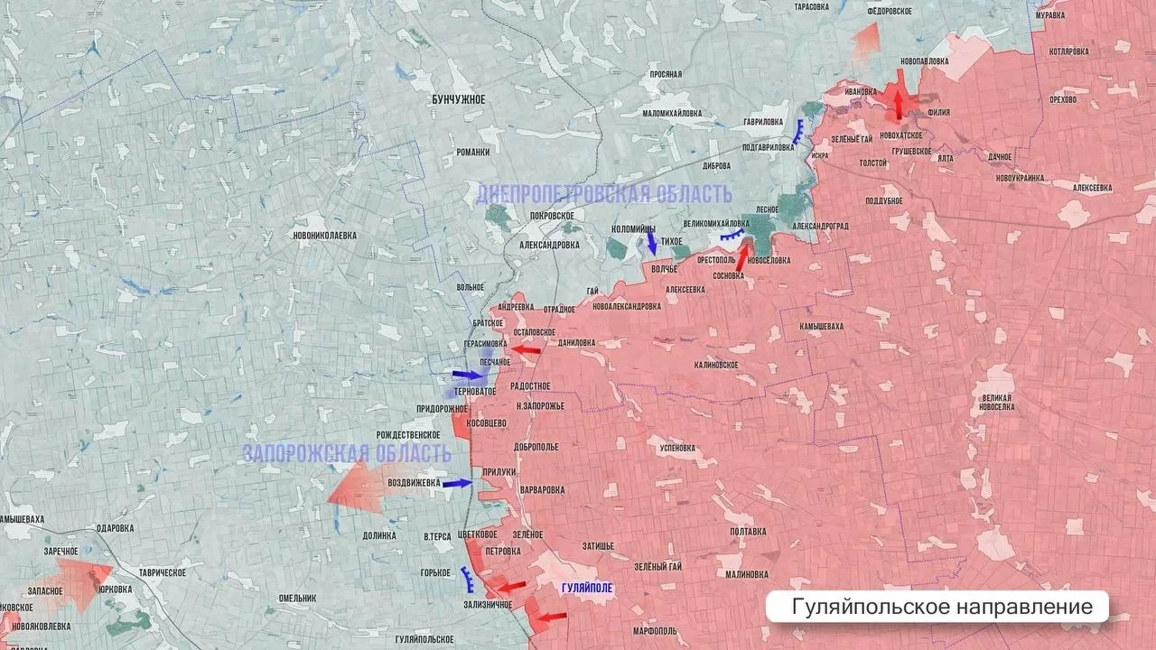 В свою очередь на Гуляйпольском направлении украинские формирования предприняли несколько безуспешных попыток контратаковать на рубеже Зализничное - Цветковое. В то же время на участке Прилуки - Доброполье российские войска перехватили инициативу: противник потеснен на запад, а часть ранее утраченных позиций успешно восстановлена.