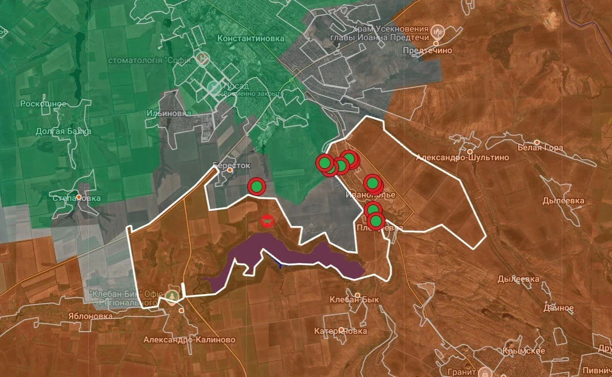 Под Константиновкой российские силы наращивают давление в районах Берестка и Ильиновки, стараясь закрепиться в южной части города. Восточнее, у Миньковки, идут ожесточённые встречные бои.