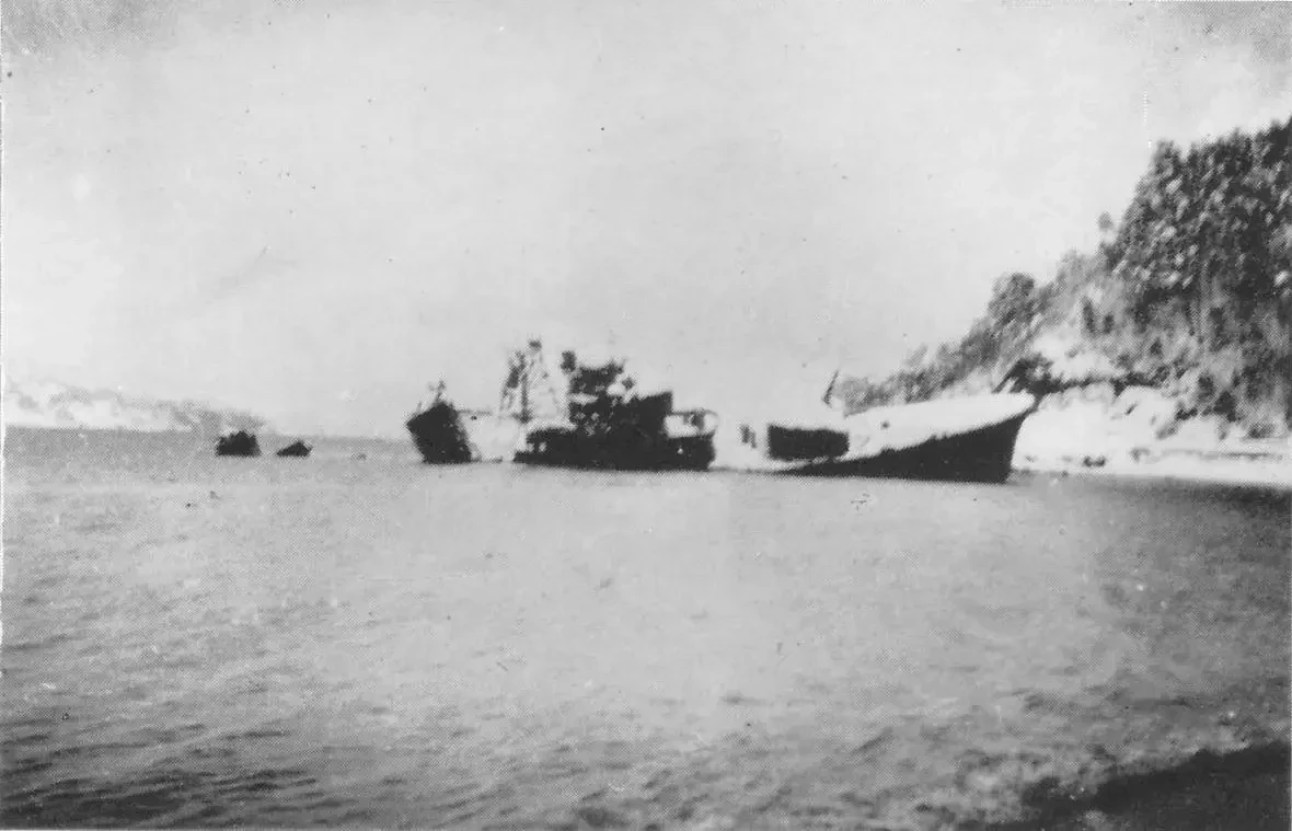 Фотография грибовидного облака, образовавшегося в результате взрыва «Ямато». Эсминцы «Юкикадзэ», «Хацусимо» и «Фуюцуки» пытаются подойти к «Ямато» для спасения экипажа.