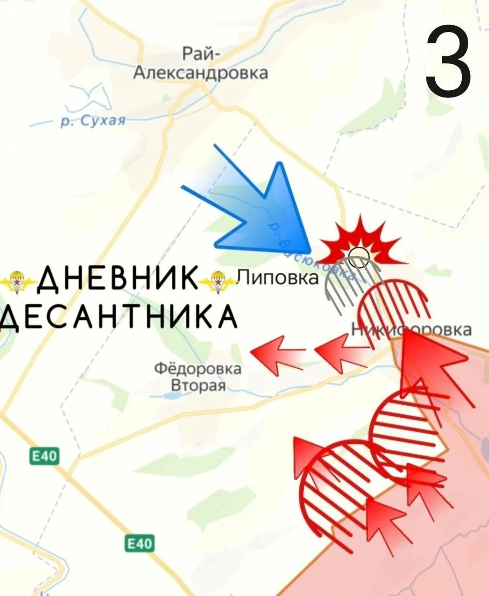 Севернее ведутся бои за Кривую Луку, а в районе Резниковки и Никифоровки российские части расширили зону контроля, продвигаясь к Липовке.