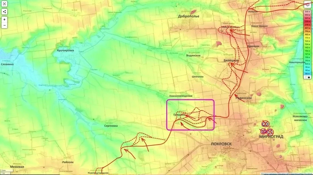 Однако наиболее серьезные события разворачиваются севернее - в районе Покровска, Мирнограда и Белицкого. Российские войска местами уверенно прорывают оборону ВСУ. За населённый пункт Гришино идут крайне ожесточенные схватки: половину села уже контролируют ВС РФ, остальная часть превратилась в огромную серую зону.