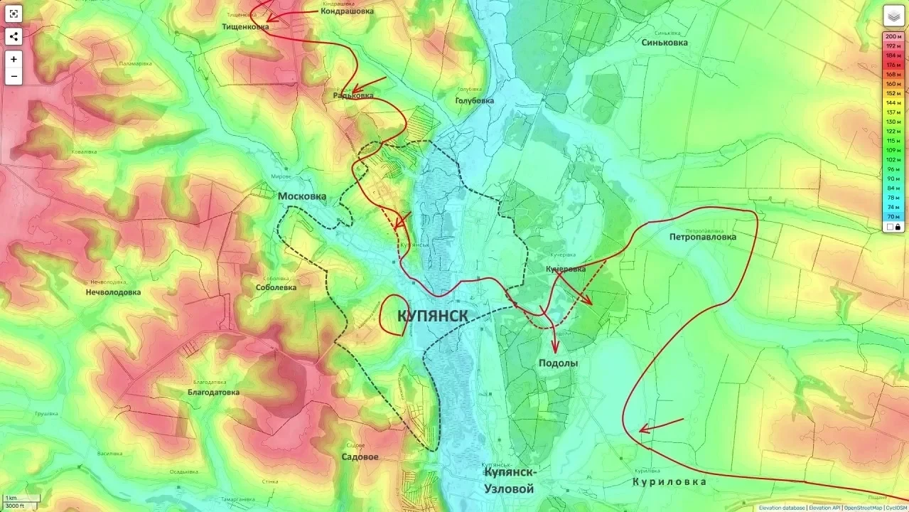 Отдельное внимание уделяется ситуации на правом берегу Оскола. В Коровьем Яру и Александровке идут тяжёлые бои, а до ключевой трассы у Рубцов остаётся менее десяти километров. В случае её перерезания группировка ВСУ в районе Боровой может оказаться в оперативном окружении.