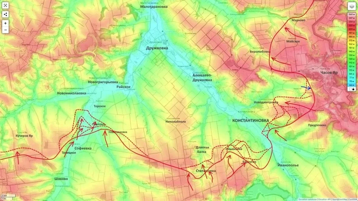 Параллельно, как подчёркивает Подоляка, в самой Константиновке и на подступах к ней сохраняется крайне напряжённая обстановка. Он говорит об ожесточённых боях и указывает, что украинская сторона пытается контратакующими действиями в районе Часова Яра сорвать российский охват города с севера. В частности, задача противника, по оценке блогера, состоит в том, чтобы выбить российские силы с высот северо-западнее Предтечино и тем самым облегчить положение своей константиновской группировки.