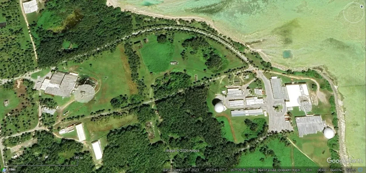 Спутниковый снимок Gооglе Еаrth: элементы радарного комплекса ALTAIR на атолле Кваджалейн. Снимок сделан в июне 2023 года