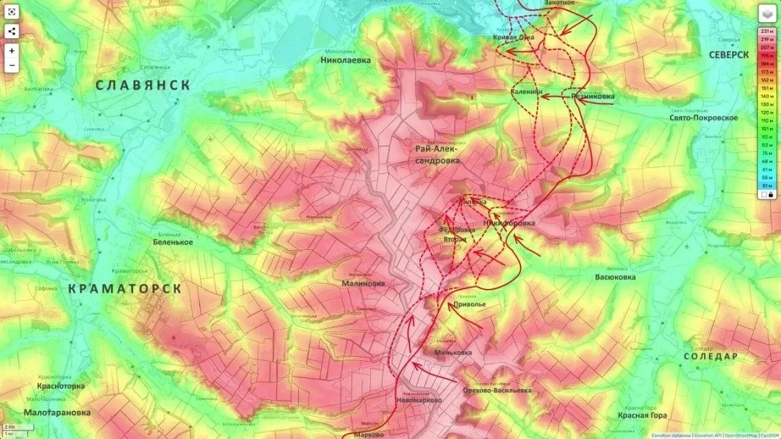 На Славянско-Краматорском направлении не смолкают ожесточённые бои, а российские силы постепенно формируют угрозу важным украинским позициям. Он сообщает, что подразделения 3-й армии и Добровольческого корпуса ведут наступательные действия сразу с нескольких направлений в районе Рай-Александровки.