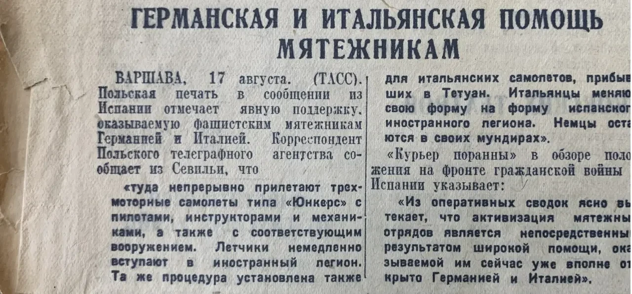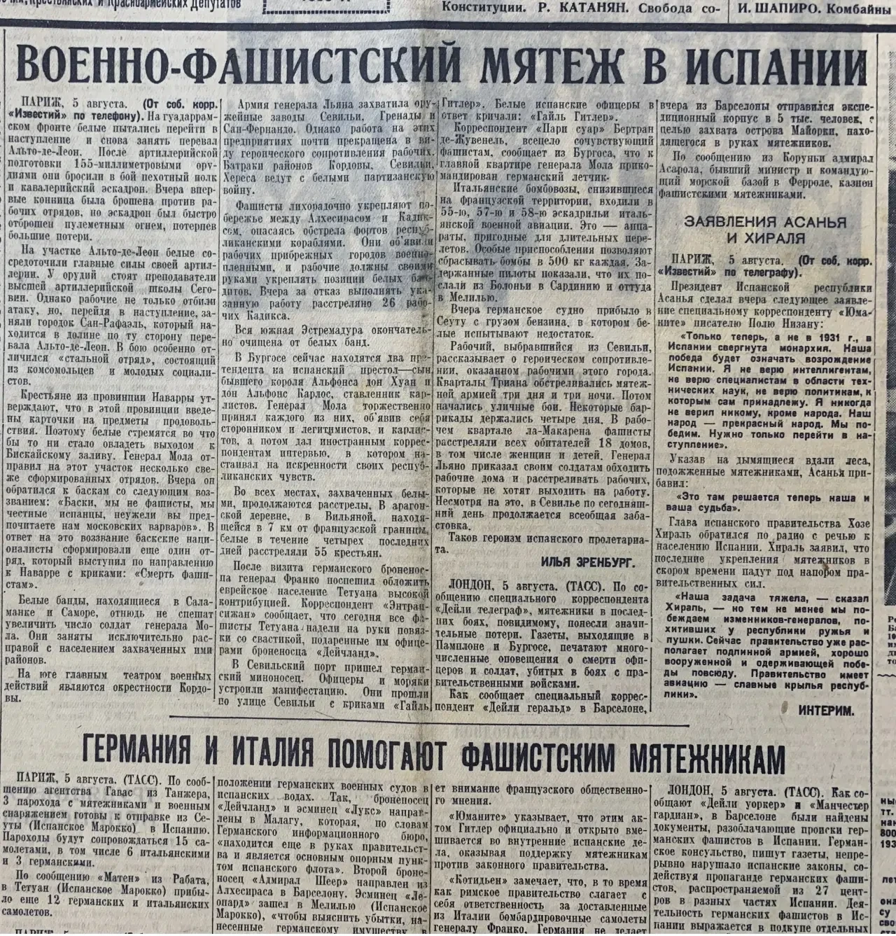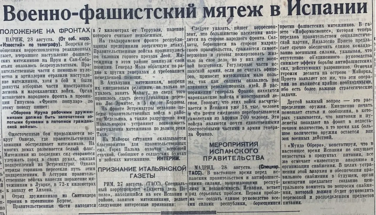 5 августа. Сообщается о помощи мятежникам со стороны Германии и Италии. Вот после этого вполне можно было бы сказать: «Кто принимает помощь от фашистов, тот и сам фашист!». Все было бы логично и обоснованно