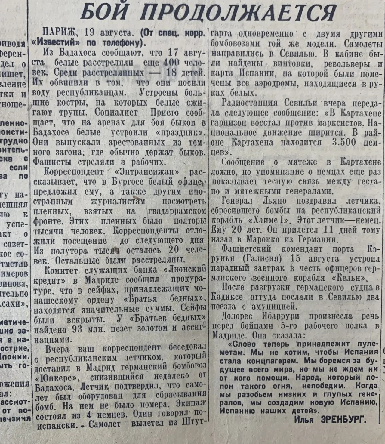 19 августа. Статья Ильи Эренбурга. Интересно, что он начал делить в ней участников войны на белых и красных