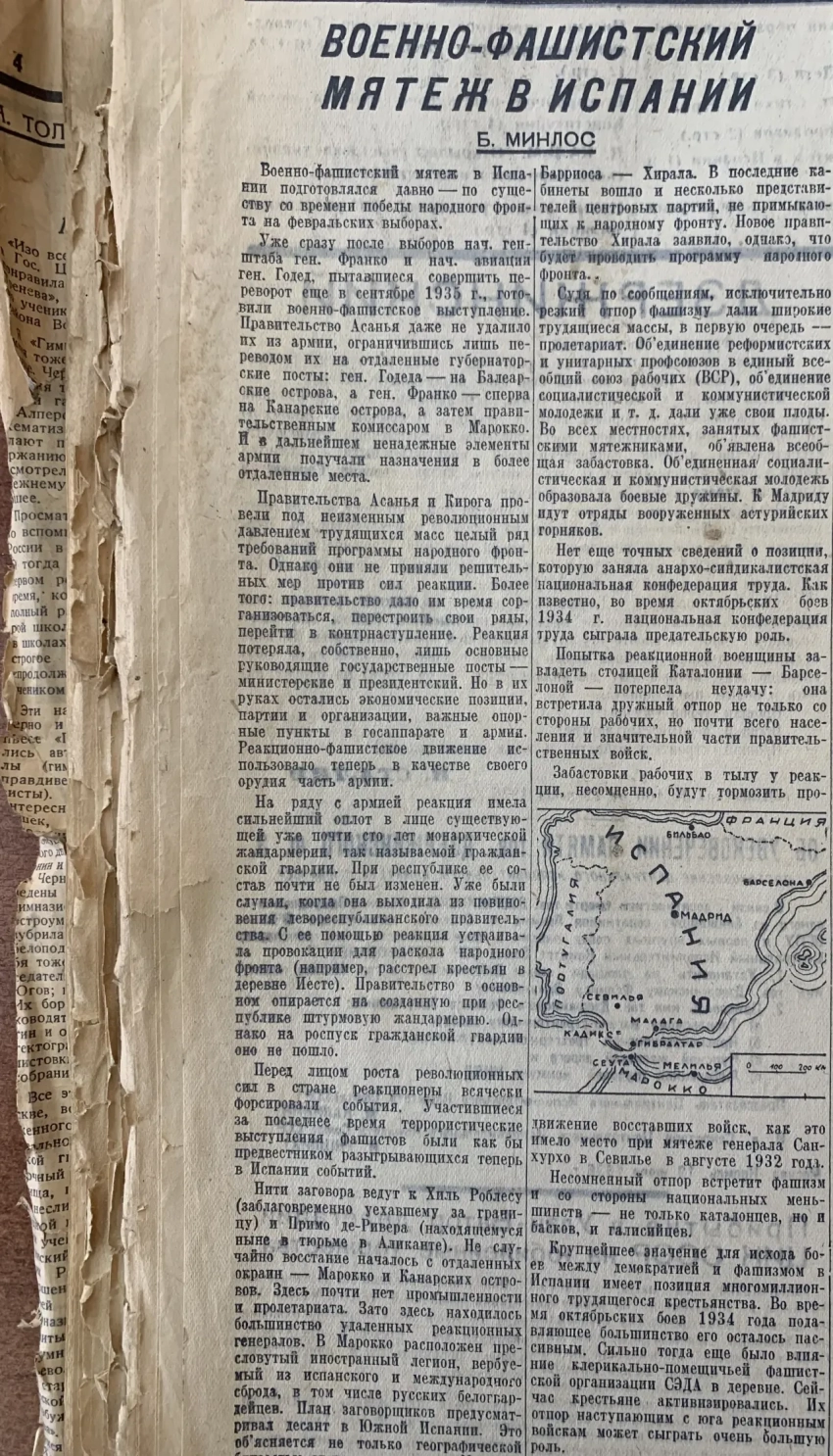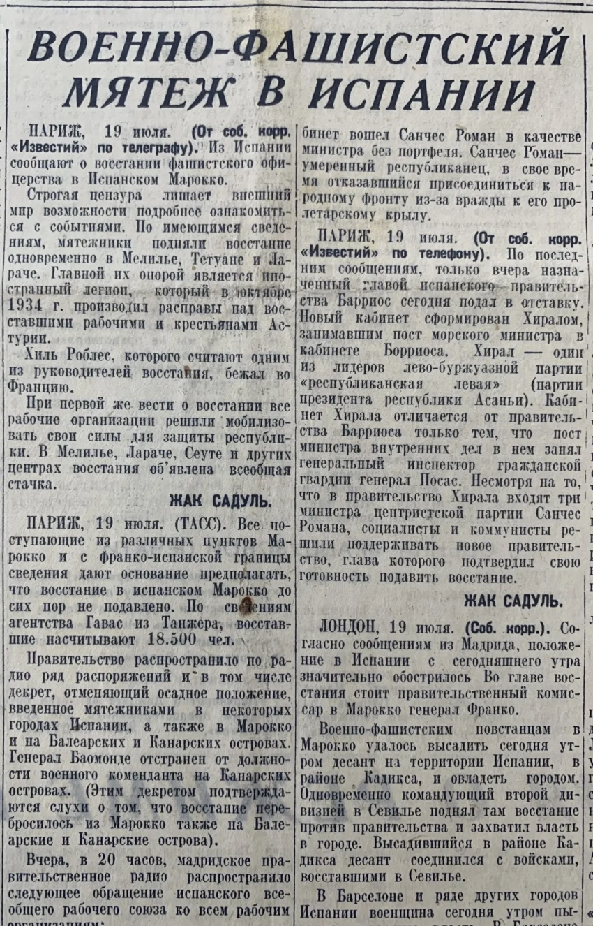 Первое сообщение о мятеже в Испании, и сразу же мятеж объявлен «фашистским». К чему было так спешить, непонятно… В политике вчерашний враг может легко стать другом – и наоборот. А тут р-а-а-з – и ярлык. Понятно, что каждый, кто выступает против законного правительства – мятежник. Но вот фашист ли он при этом… Так что стоило бы хотя бы немного подождать