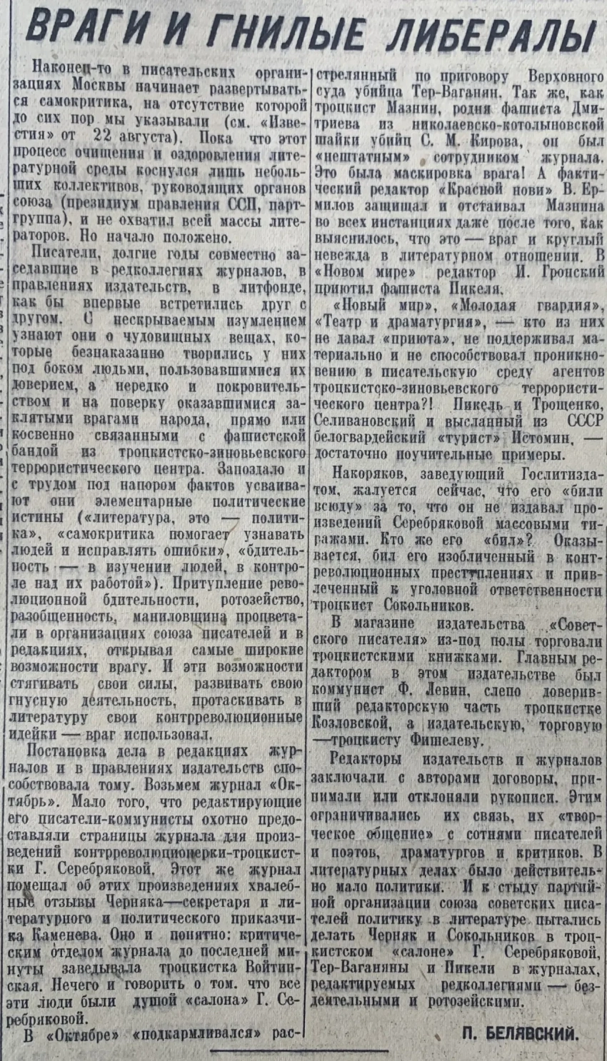 А вот это очень интересный материал, пройти мимо которого просто невозможно. Фашистов и либералов стали искать в писательской организации. Нет, не в Испании – у нас! Галину Серебрякову объявили контрреволюционеркой и троцкисткой… Но получается довольно-таки странно: троцкист Сокольников, оказывается, «бил» заведующего Гослитиздатом за то, что он не печатал массовыми тиражами сочинения троцкистки Серебряковой. Как же так? Один троцкист мешал своей коллеге? И вот такое писали, и этого, что, никто не замечал, да? Ну явная же нелепость… Но интересно. До этого мне такого читать еще не приходилось…