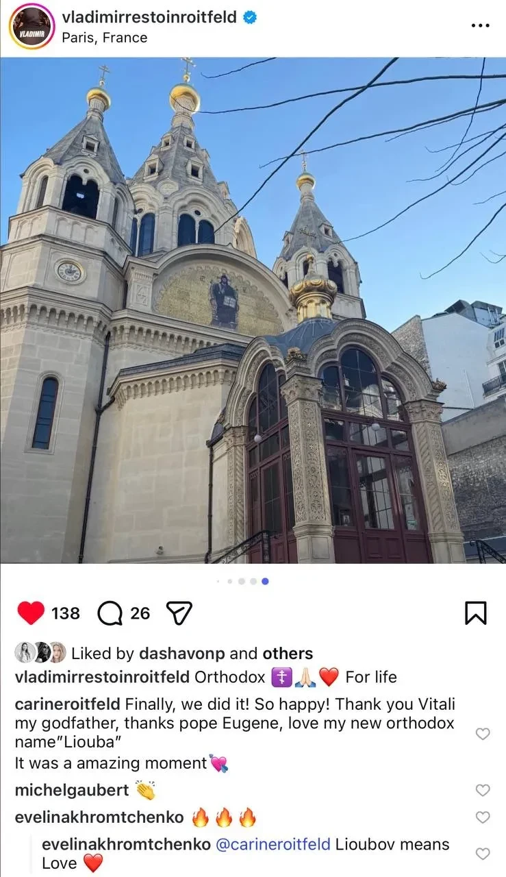 "Вчера мы с сыном крестились. Моё православное имя Люба в честь святой мученицы Любови. Это был удивительный момент. Спасибо отцу Евгению", — написала Ройтфельд.