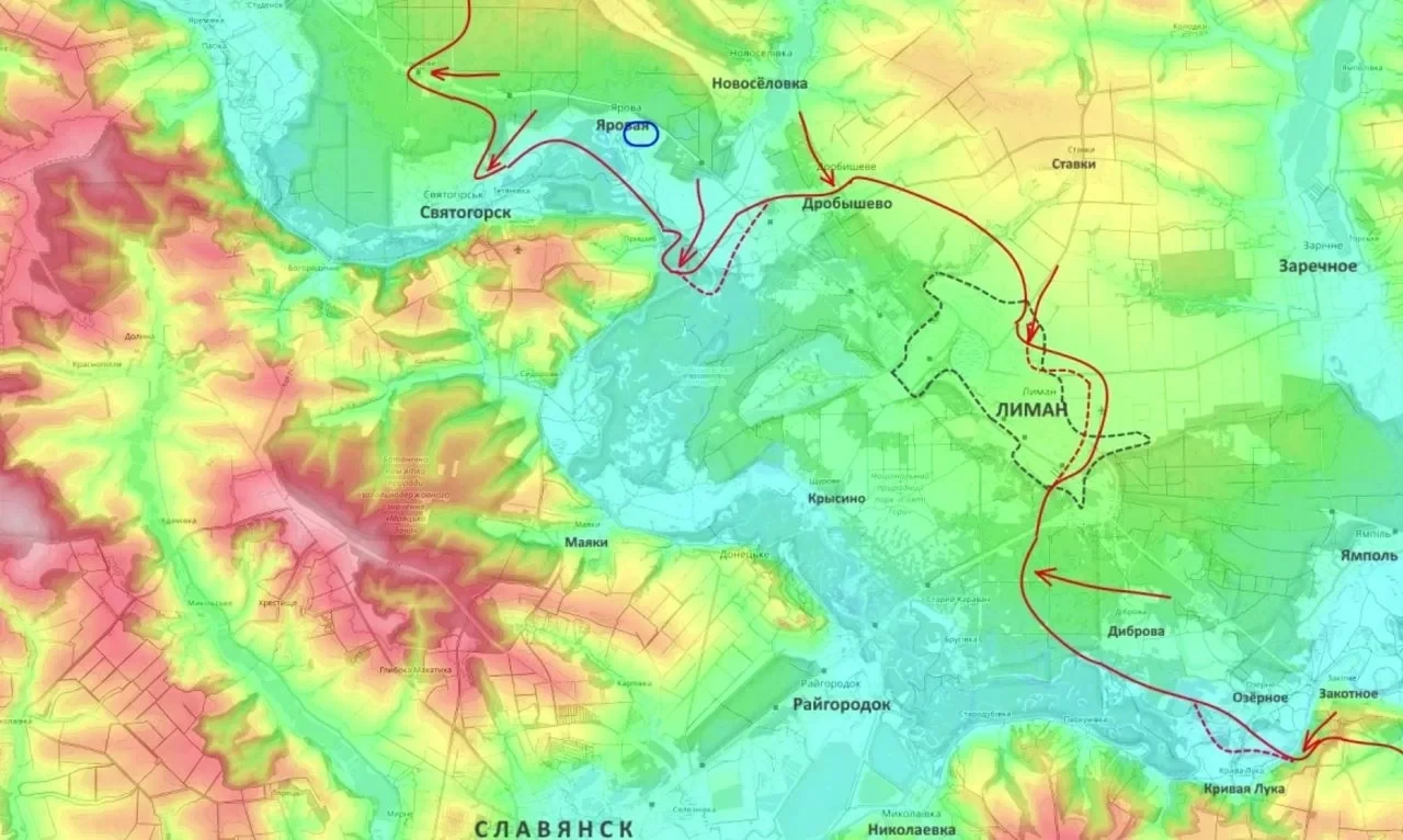 В Красном Лимане боевые действия идут уже в черте города, в районе железнодорожного вокзала. Российские части вбивают клин со стороны Новоселовки, отрезая пути снабжения. Украинские источники признают ситуацию критической.
