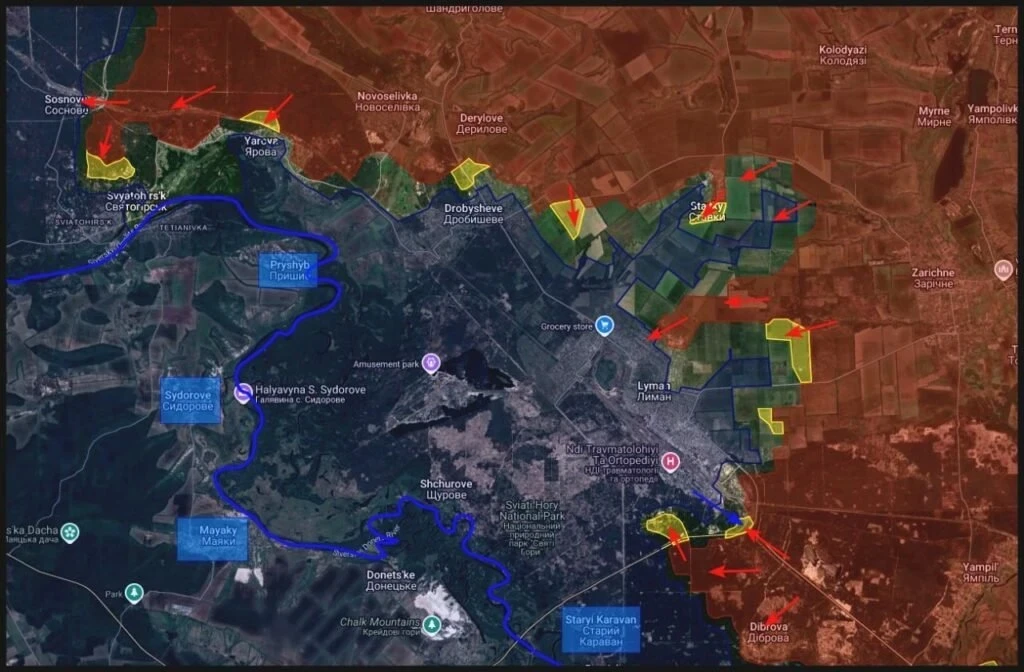 На Краснолиманском фронте ВС РФ закрепились на юго-востоке Красного Лимана и продвигаются на северо-запад, чтобы установить контроль над дорогой на Славянск. Улучшили позиции в лесах на севере и востоке Дробышево. Выше по фронту наши штурмуют Святогорск, дожимают противника в Александровке, наступаю на Коровий Яр.