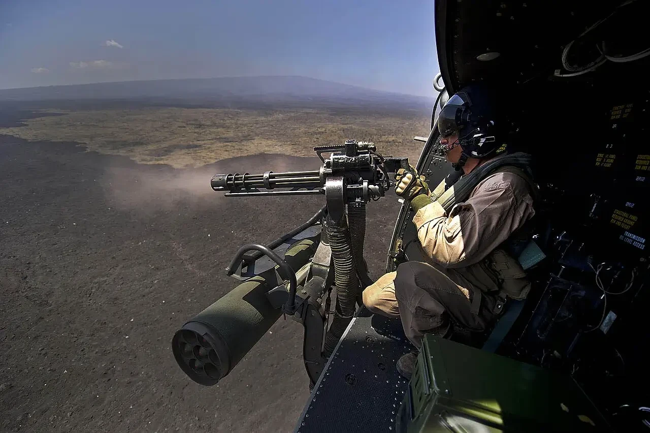 Капрал Сиппл ведёт огонь из «Минигана» с борта вертолёта UH-1Y 169-й эскадрильи КМП США, Гавайи, июль 2012 года