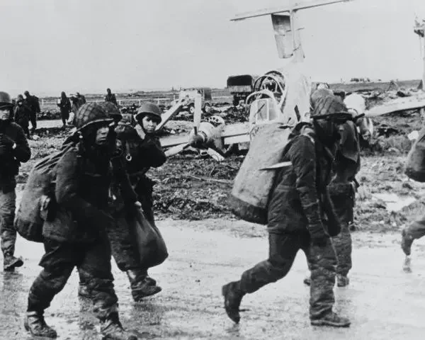 Британские парашютисты с аргентинскими поенными под Гуз-Грин
