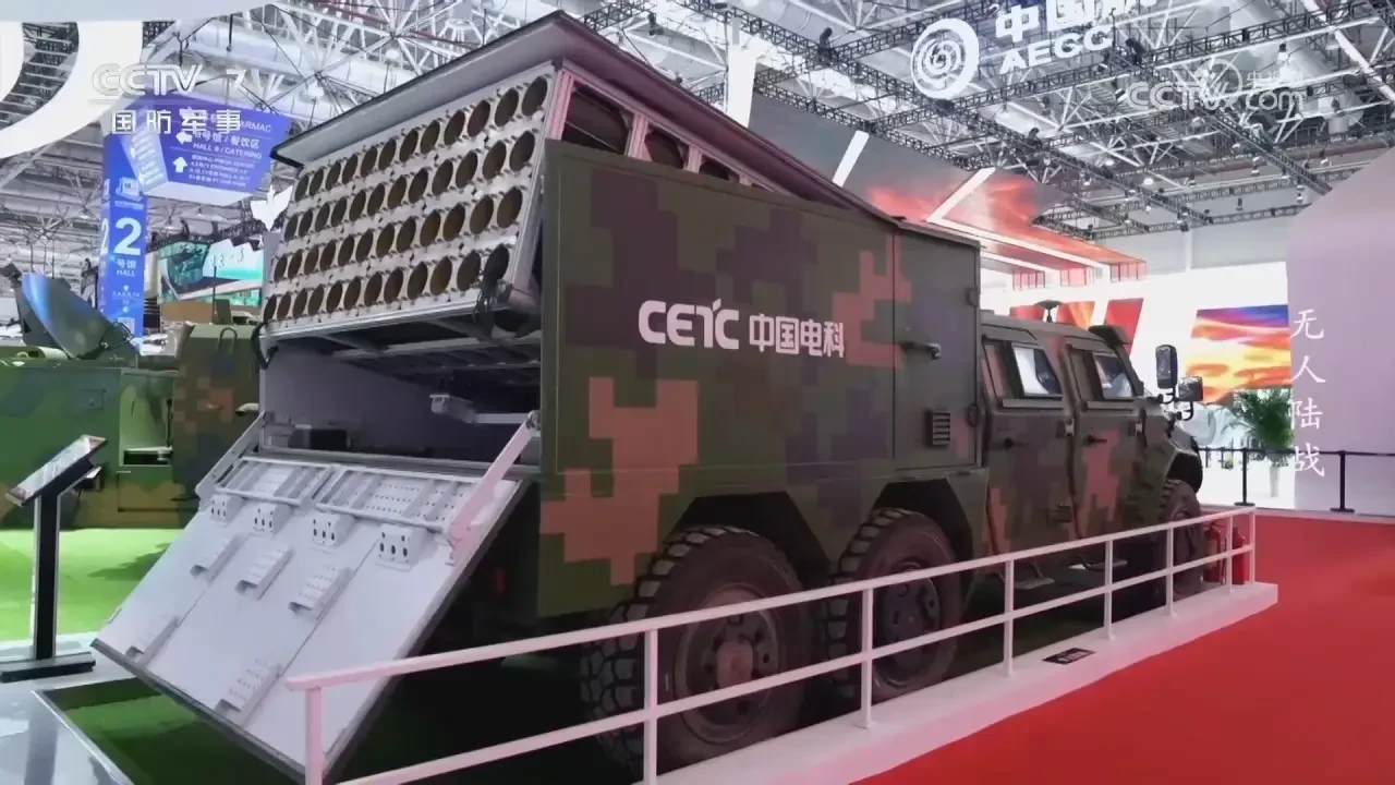 В качестве одного из средств для запуска БПЛА была показана самоходная пусковая установка типа Swarm. По известным данным, это изделие было разработано Китайской академией электроники и информационных технологий (CAEIT). Первый показ готового изделия состоялся в 2020 г. на одной из китайских выставок. Предполагалось, что в ближайшее время такая техника появится в армии.