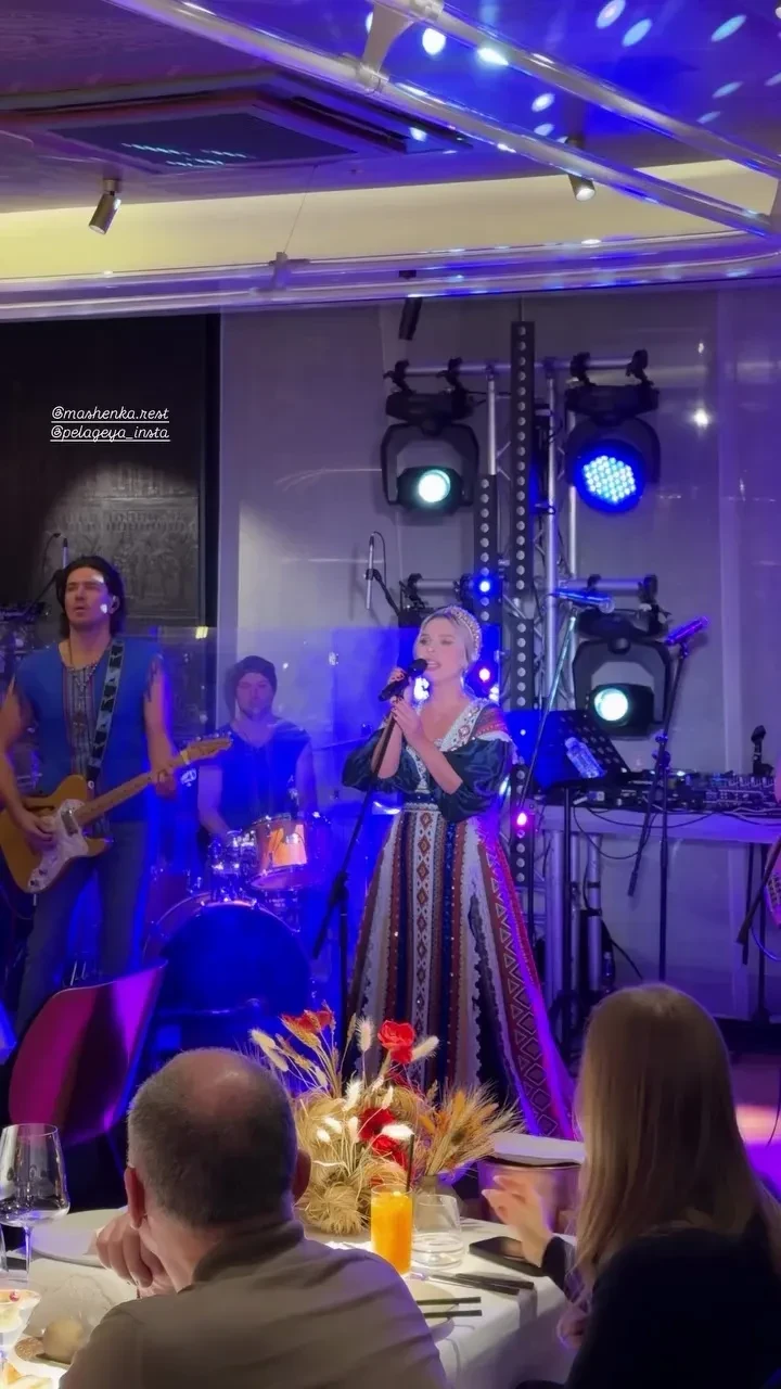 Со сцены выступала Пелагея, которая исполнила песню "Конь". Гостей угощали картошкой и варениками с крабами под водку.