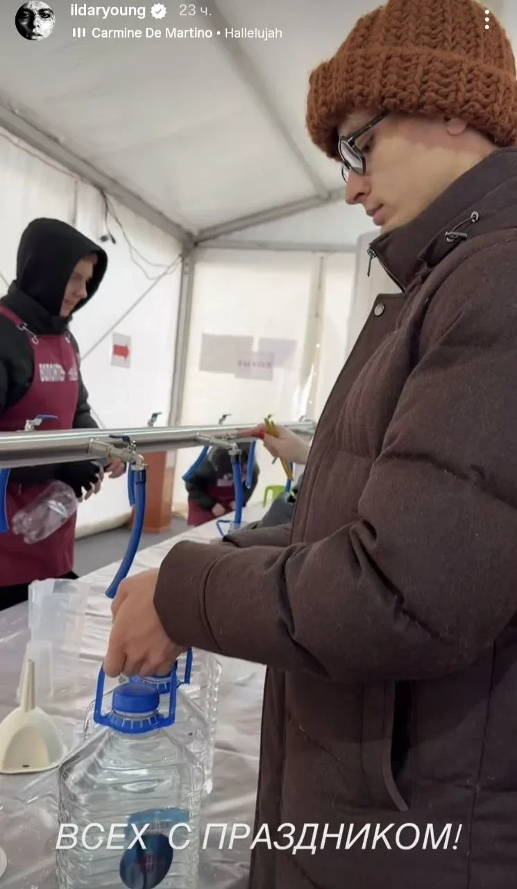 https://t.me/spletnik2006/47360Окунулись в прорубь супруга ресторатора Бориса Зарькова Ирина, гонщик Никита Мазепин и рэпер Macan, который недавно ушёл в армию. Юлия Пересильд ограничилась тем, что окунулась лицом в снег, Ксения Бородина с мужем Николаем Сердюковым предпочли прогулку по Суздалю. Возлюбленный Евгении Медведевой, танцор Ильдар Гайнутдинов, поздравил подписчиков в соцсетях с праздником и показал кадры, на которых занят набором крещенской воды.