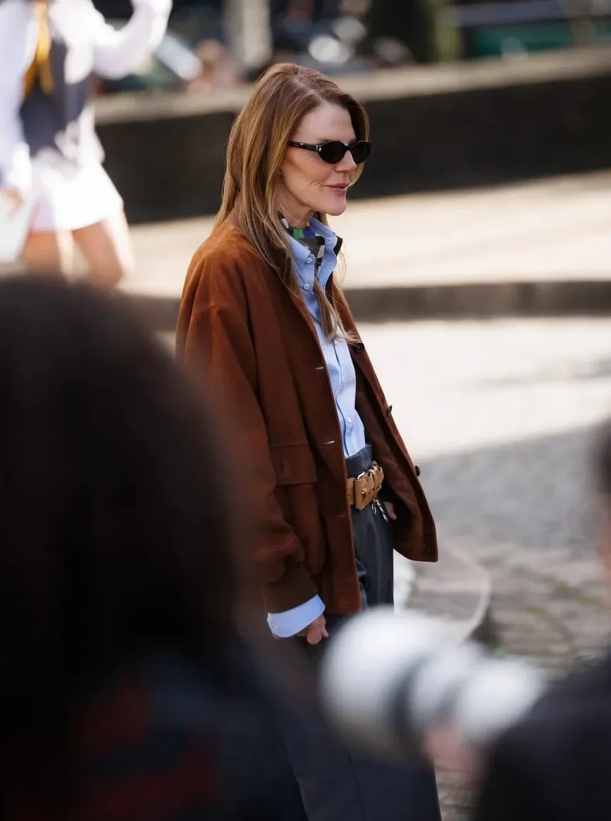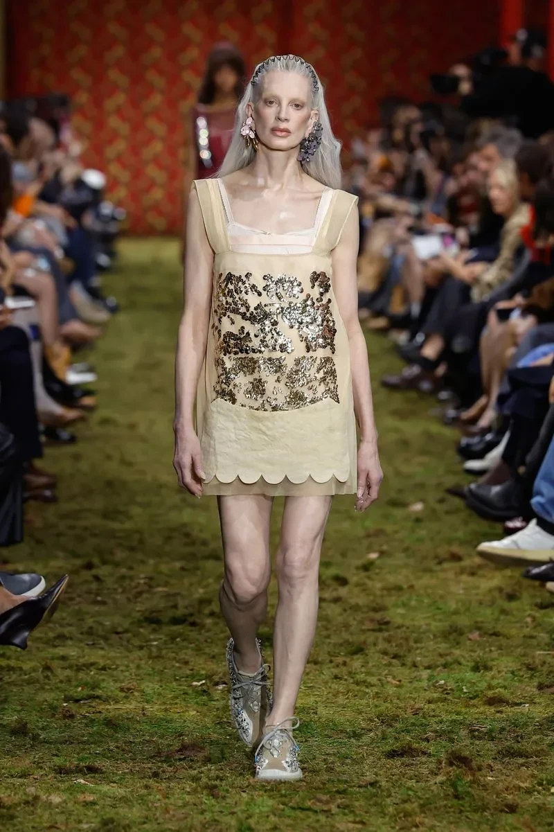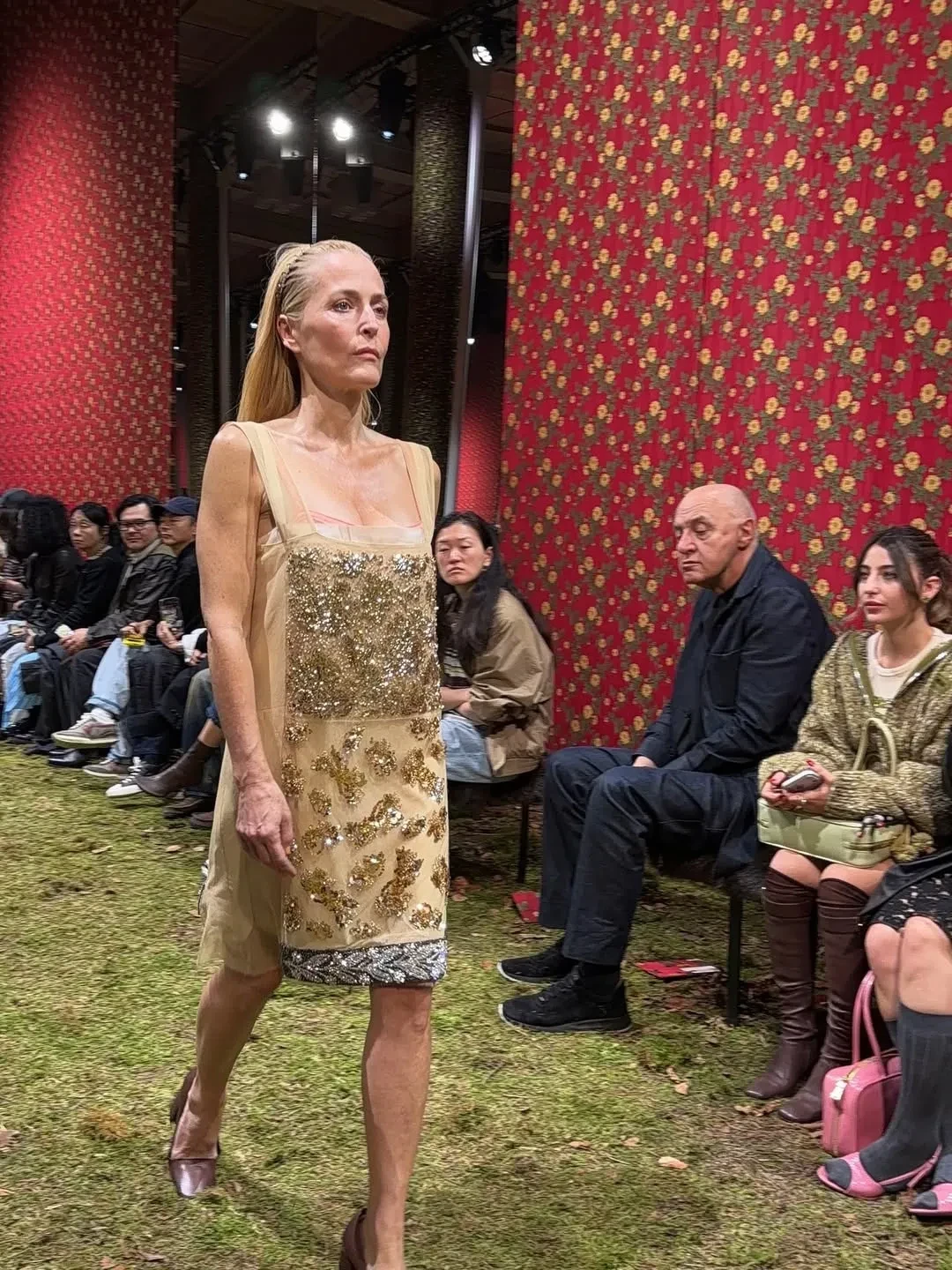 Неделя моды в Париже: Елена Перминова в "советском" платье, Оксана Самойлова (в чулках) среди гостей и Джиллиан Андерсон — на подиуме на показе Miu Miu