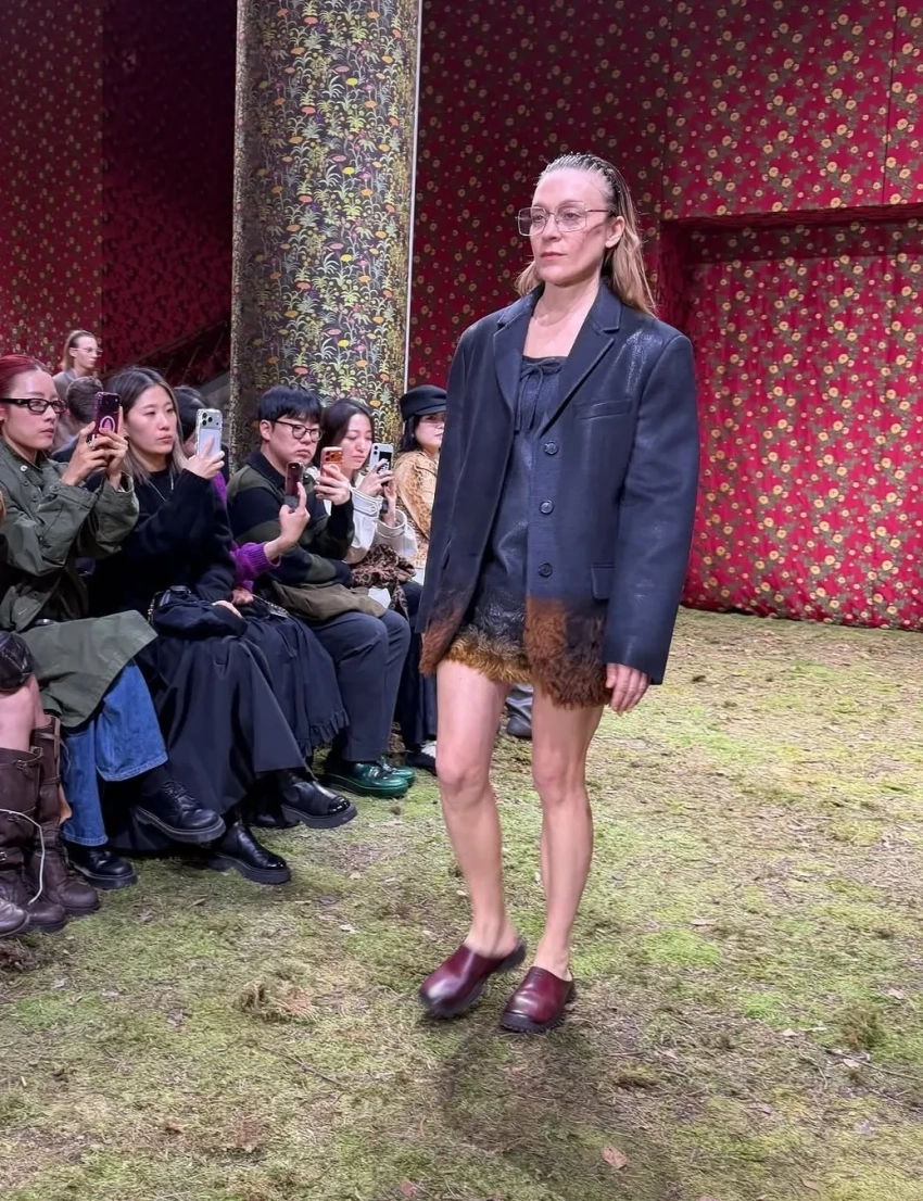 39-летняя Елена Перминова надела платье в "советском" стиле с цветочным принтом, а 37-летняя Оксана Самойлова пришла в мини-юбке и чулках. Ксения Шипилова примерила кожаный фартук из предыдущей коллекции бренда, посвящённой женщинам-рабочим и домохозяйкам.