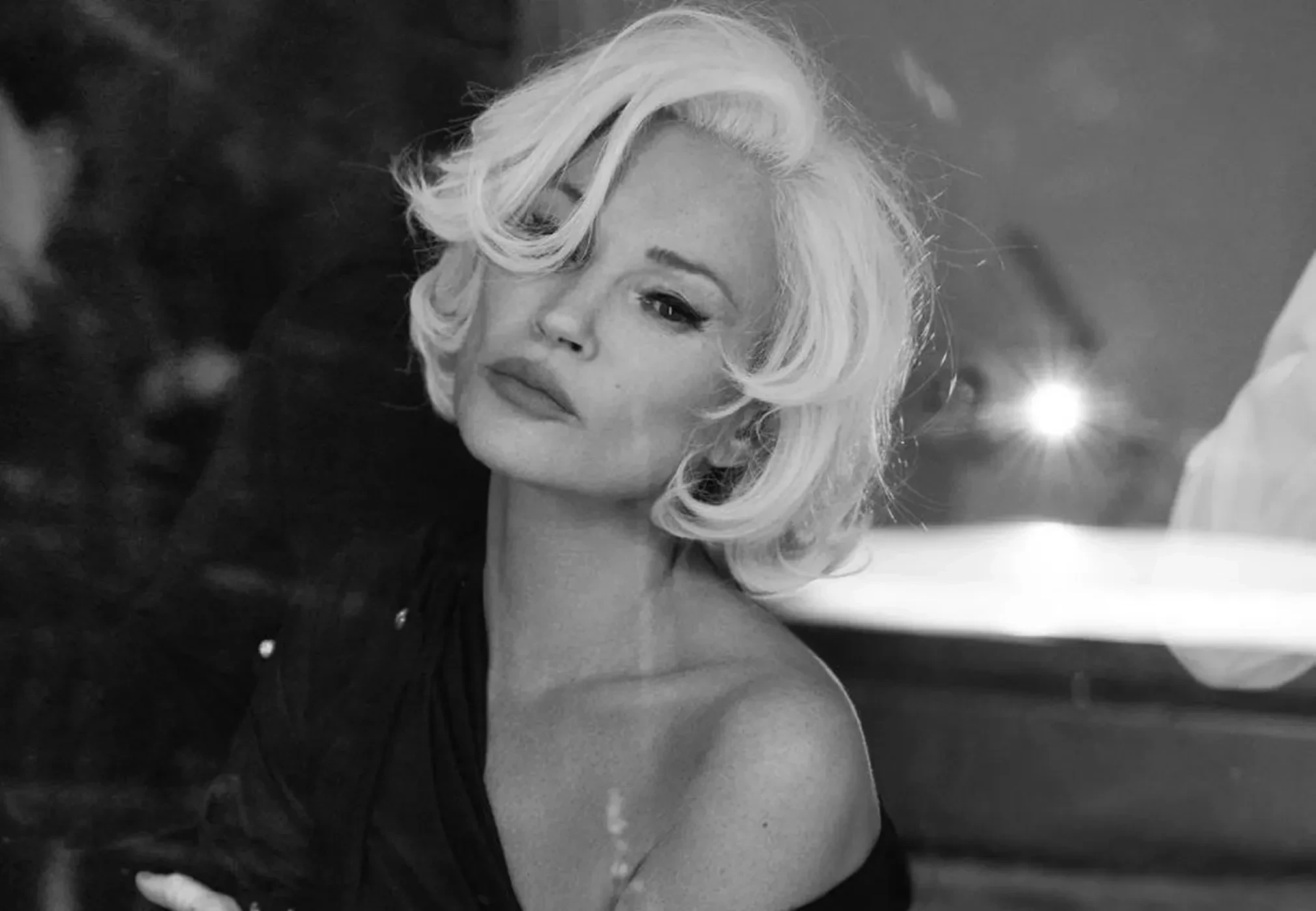 Мосс позировала перед камерой в платиновом парике, сидя на рояле и в салоне кабриолета.
