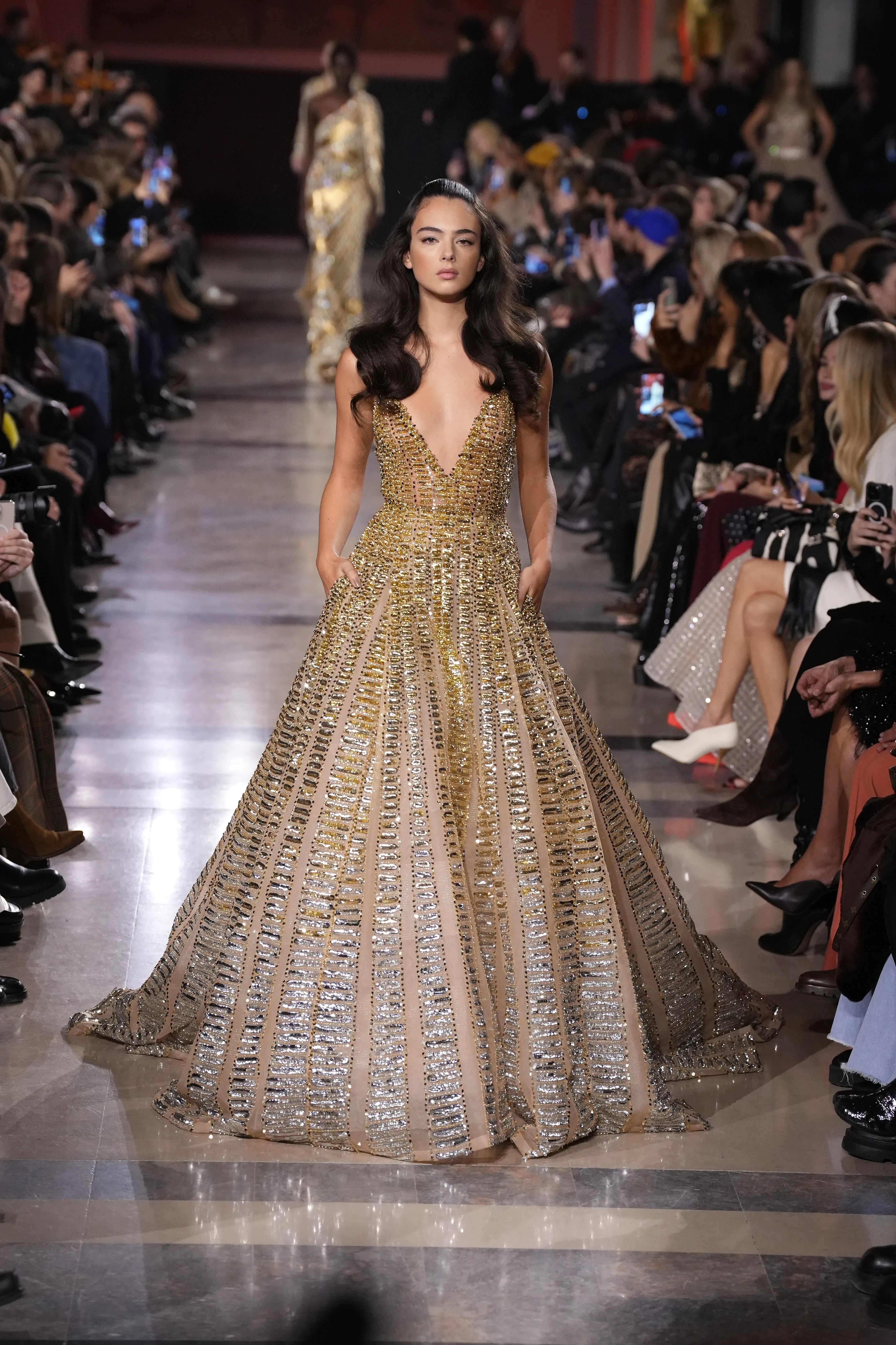 Дева дефилировала в блестящем золотом платье с глубоким декольте и пышной юбкой. Образ завершали причёска с заколотыми передними прядями и естественный макияж.