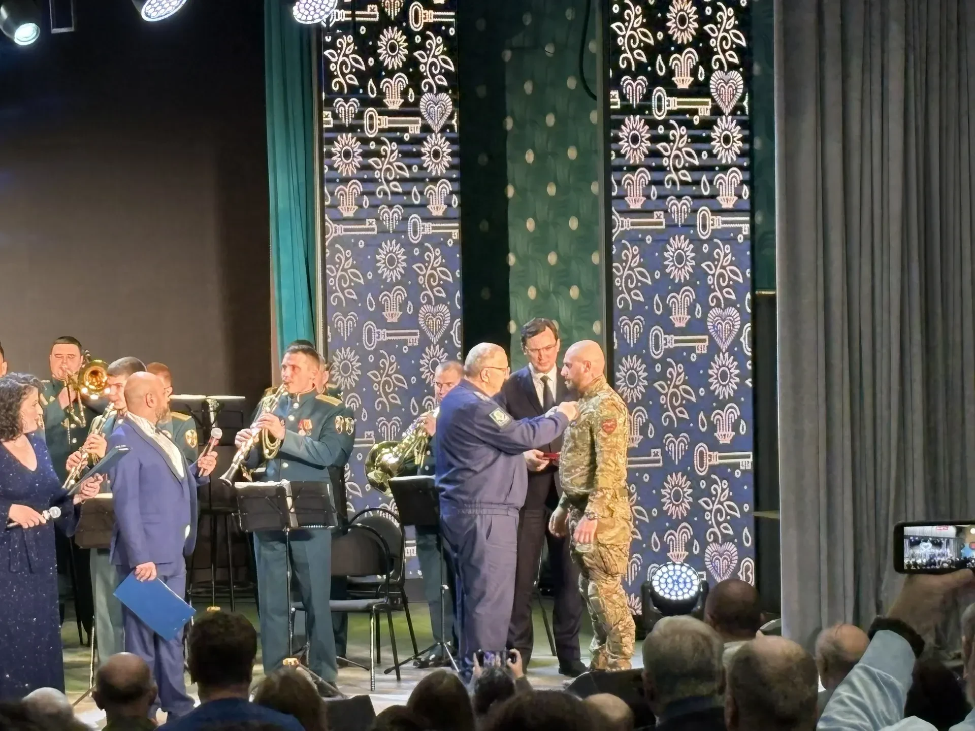 Почётные гости выразили слова признательности защитникам Отечества и сердечно поздравили с праздником военнослужащих и всех собравшихся. Особым моментом церемонии стало награждение: Глава города Евгений Иванович Моисеев вручил медаль За храбрость II степени участнику специальной военной операции Игорю Михайловичу Шевчуку.